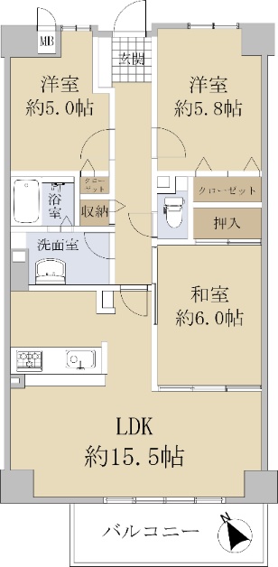 洋室5.8畳 洋室5.0畳 和室6.0畳 LDK15.5畳 |