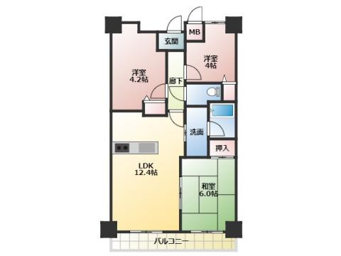 和室6畳 洋室4畳 洋室4.2畳 LDK12.4畳 |